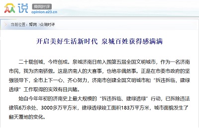 史益豪同学对济南市“拆违拆临、建绿透绿”关心关注,2017年1月启动的济南市“拆违拆临、建绿透绿”行动,全年拆除违法建设3286万平方米、违法户外广告1.7万余块,拆违建绿3000余亩,拆违拆临工作取得历史性突破,城市环境发生巨大变化。史益豪同学从自己的视角,在作品《开启美好生活新时代 泉城百姓获得感满满》中展示拆违拆临带来的变化,作为爱济南市民记者,他用镜头和文字记录下一个个“天蓝风清”的美好瞬间,为辛劳的拆违拆临工作者们歌与咏、鼓与呼。