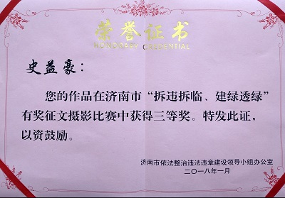 近日,由济南市依法整治违法违章建设领导小组办公室、济南市城管执法局、济南日报报业集团联合举办的“拆违拆临、建绿透绿”征文及摄影大赛评选结果出炉。我校yl永利集团304am史益豪同学的作品《开启美好生活新时代 泉城百姓获得感满满》荣获三等奖。