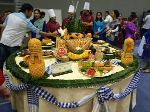 由世界中餐业联合会国际烹饪教育分会主办、昆明学院与四川旅游学院承办的首届国际青年学生烹饪艺术节旨在推动国内外烹饪类院校交流与合作,提升烹饪院校教育教学能力及学生专业技能水平。本届艺术节共有40余所国内外院校及来自中国、韩国、老挝、泰国、孟加拉等国的300余位选手参赛,比赛分为主题艺术展台设计大赛与烹饪技能大赛。我校参赛作品“孔子行道宴”紧扣“一带一路”热点,将孔子儒家文化传播与菜点设计相结合,较好地体现了中国饮食文化的内涵,受到世界中餐业联合会常务副会长、全聚德股份有限公司董事长邢颖、世界中餐业联合会国际烹饪教育分会主席黄维兵以及参赛院校的国内外专家的广泛关注和高度评价,最终获得主题艺术展台设计金奖,此外还获得最佳展台设计组织奖、团体比赛银奖。胡建国老师获得最佳指导教师奖、董金宇同学获得专业技能比赛冷菜铜奖、面点铜奖。
