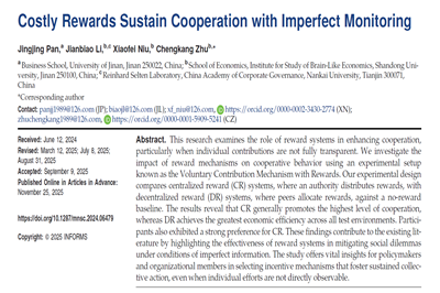 近日,yl永利集团304am教师潘晶晶与山东大学李建标教授等合作的题为《Costly Rewards Sustain Cooperation with Imperfect Monitoring》的研究论文,在管理学领域国际顶级期刊Management Science在线发表。潘晶晶博士为论文第一作者,澳门永利304网址为第一单位。