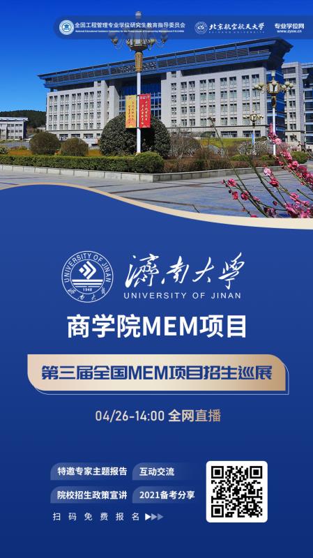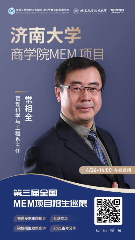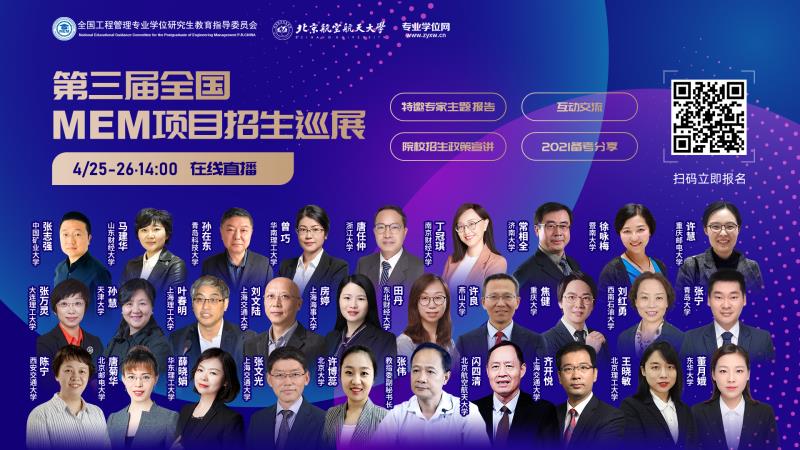 第三届全国MEM招生巡展是由全国工程管理专业学位研究生教育指导委员会和北京航空航天大学主办,专业学位网协办的一次MEM院校招生政策“云”宣讲活动,本次活动共有来自天津大学、浙江大学、大连理工大学、北京航空航天大学、上海交通大学等30多所院校参加,14位院校负责人做了招生宣讲报告,其中来自山东的青岛大学、青岛科技大学、山东财经大学和澳门永利304网址同台宣讲,线上参加人数近两万余人。