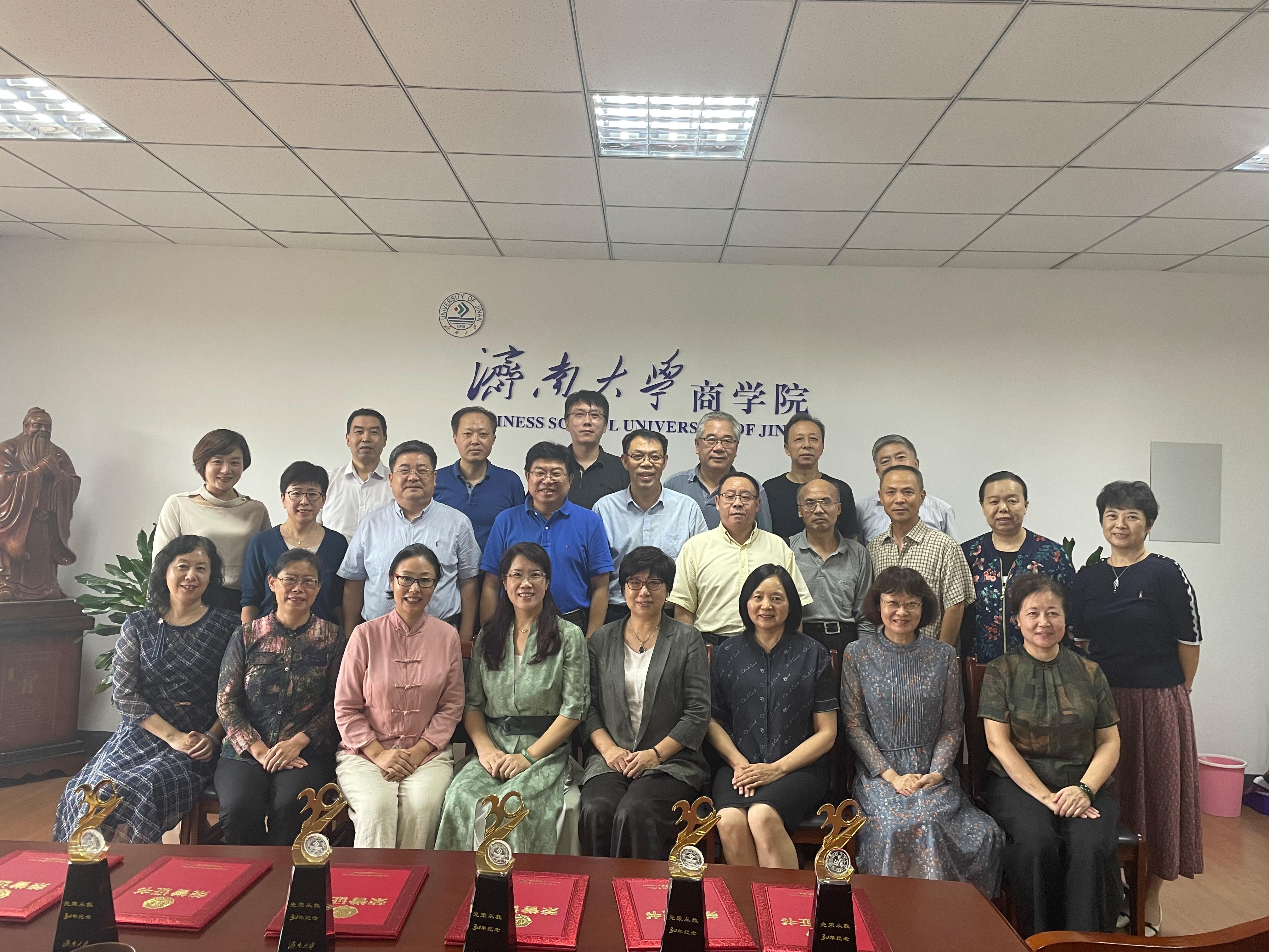 葛金田书记代表学院向从教三十年的每位教师表示祝贺、感谢,并致以敬意,三尺讲台,三十年坚守,感谢他们三十年如一日的付出,为教育事业做出的无私奉献。葛金田表示,商学院快速发展得以今日之成绩,是全体教师凝心聚力的成果,当前学院正值建设高水平学院的重要时期,希望有经验的老教师们继续发挥榜样作用,带动年轻教师进步。同时也期望各位老教师们立足当下,把握新形势,继续保持工作热情,赓续、传承这份宝贵的精神,为学院发展作出新的更大贡献。
