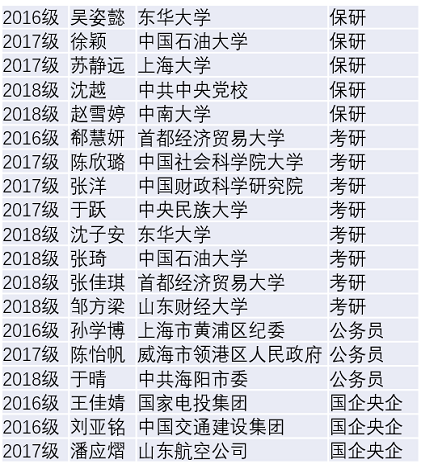 本科生一次就业率在90%以上,主要去向是农行、招商、浦发等金融机构,中国重汽、鲁能集团、蒙牛集团等知名企业和信永中和、瑞华、立信等会计师事务所。近15%的优秀毕业生考取厦门大学、中国人民大学、山东大学、中国海洋大学、东北财经大学、天津财经大学等知名高校的研究生。近10%的毕业生考取财政、税务、人社等部门或系统的公务员。近5%学生到加州大学、纽约大学等国外大学留学。为提高学生“两创”能力,实施“一生一赛”措施,鼓励大学生参加各类大赛,近三年获得省级以上科技创新竞赛奖80余项,其中CIMA全球商业精英挑战赛(GBC)华东区域决赛冠军,全国“挑战杯”创业计划大赛铜奖1项、全国大学生会计信息化技能大赛全国一等奖2项。