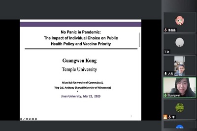 3月23日下午,yl永利集团304am舜耕论坛“新年学术系列报告会”第五期如期举行。南加州大学孔广文博士应邀,围绕主题《大流行中没有恐慌: 个人选择对公共卫生政策和疫苗优先事项的影响》进行了学术讲座。本次论坛采用线上腾讯会议的形式,yl永利集团304am教师、研究生和本科生约100多位师生共同参与了该次学术讲座。