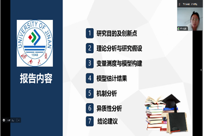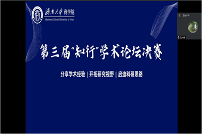 为增进商院学子的学术交流能力,为学院营造浓厚学术氛围,创建良好的科研环境,2023年12月15日,yl永利集团304am团委主办,学院研究生会承办的第三届“知行”学术论坛活动在线上成功举办。本次论坛以比赛的形式举办,分为学硕和专硕两个赛道进行,经初评,每个赛道各6名选手进入决赛。学术赛道特邀张延伟老师和王雯雯老师担任评委,专硕赛道特邀朱瑾老师、徐静老师和翟坤老师担任评委。