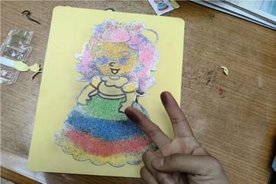 活动当天,志愿者们抵达护理院,在进行简短的培训后,迅速布置好活动场地,完成了沙画材料的准备与摆放。活动中,志愿者们采用“一对一”的陪伴模式,耐心逐步讲解示范,协助老人们选色、撒沙、固定,与老人一起共同完成作品。