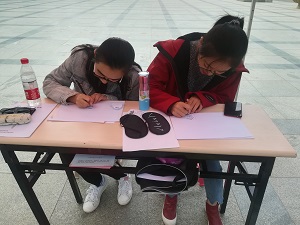活动准备阶段,活动负责人组织会议进行小组分工,明确各组任务,并通知办公室准备物资,同时排出值班表通知相关人员做好值班宣传工作。活动伊始,工作人员到位并布置现场,热情耐心地为同学们介绍活动的内容和形式,并积极邀请过往同学一起参加盲人小游戏,体验盲人生活艰辛。随着参与人员越来越多,盲人体验小游戏正式开始。活动进行时,参加游戏的同学们戴上眼罩用嗅觉闻盛有不同气味液体的纸杯并成功回答出液体名称。紧接着,同学们戴上眼罩在白纸上画值班人员指定的物体。游戏最后,工作人员让同学们在提前做好的人脸画板上补全人的眼睛、鼻子等五官。游戏结束后,工作人员邀请同学们在便签上写几句体验的感想、鼓励盲人的话或是自己的活动感触,将其与游戏作品一起张贴在展板上。最后,活动在同学们的欢声笑语中圆满结束。