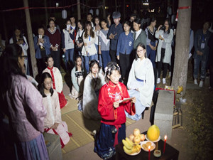 活动宣传期,华歌未央汉服社社员身穿汉服在经管楼前通过摆展板、现场跳舞、发放宣传页等形式宣传此活动,吸引了许多同学驻足围观报名。晚上7点,活动正式开始,参与同学领取配有答题提示的纸笔入场,进行“游灯会,猜灯谜”活动。纸灯挂于银杏树之间,沿林荫小道排列,看灯猜谜的同学来来往往,兴致盎然。灯会设置三道关卡,依次闯关,最后根据排名可获得荧光棒和手环等奖品。灯会进行期间,汉服社全体成员进行祭月仪式。仪式包括陈设,祭月,上香祭酒,读祝,拜月等十二环节,充分再现了古时祭祀文化的传统仪式。不仅是参会同学,汉服社成员身着唯美汉服,亦参与其中,气氛十分和谐融洽。仪式结束后,相关工作人员公布灯谜答案,宣布获奖名单,表演精彩的舞蹈,并合影留念。