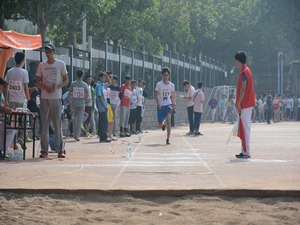 比赛开始前,各位运动员在场下做了充分的热身准备,灵巧的跑鞋,整齐的运动服看上去就给大家一种视觉上的冲击。压腿,伸展跳等准备活动完毕后,比赛正式开始了。比赛的每一次跳跃都牵动着观众的心。伴随着观众的呼喊和啦啦队员的助威,于志磊沉着冷静地将三级跳远的动作发挥到极致,离弦箭般的助跑,刹车似的踏跳,旋风般的腾空,一连串的动作瞬间结束,沙坑中的脚印给观众留下了大大的惊叹号。完美的动作赢得了场下观众的阵阵欢呼,为跳远比赛谱写出一曲动人的旋律。最终,于志磊凭借扎实的能力和超强的爆发力荣获男子三级跳远比赛第八名。