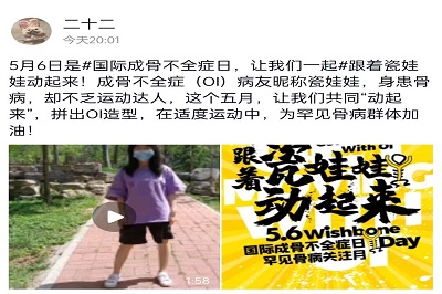 2022年5月6日,是第13个“国际成骨不全症日”。为给罕见骨病群体加油、增加同学们对这一群体的了解、提高这一群体的生活幸福感和社会参与度,5月6日至5月8日,yl永利集团304am青年志愿者协会线上举办“一起运动,我们的爱不脆弱”活动,呼吁同学们与瓷娃娃一起运动,鼓励同学们为瓷娃娃公益贡献自己的一份力量。