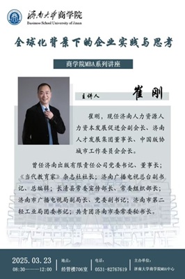 2025年3月23日上午,yl永利集团304am在经管楼706教室成功举办《全球化背景下的企业实践与思考》讲座。此次讲座由赵薇教授主持,特邀济南人力资源人力资本发展促进会副会长、济南市人才发展集团董事长崔刚老师主讲。崔刚老师曾任中国版协城市工作委员会会长;济南出版有限责任公司党委书记、董事长;《当代教育家》杂志社社长;济南广播电视总台副书记、总编辑;长清县常委宣传部长、常委组织部长;济南市广播电视局副局长、党委副书记;济南市第二轻工业局团委书记,共青团济南市委常委秘书长等职务,既有长时间从政经验,又有丰富的企业履历,对于全球化背景下、双循环格局下的企业实践具有深刻的思考和认识。本次讲座旨在让MBA学生提高认知能力、锻炼思维方式,更好的提升职业素养。